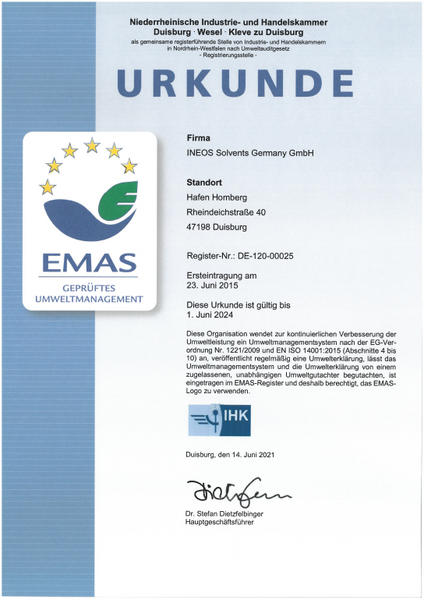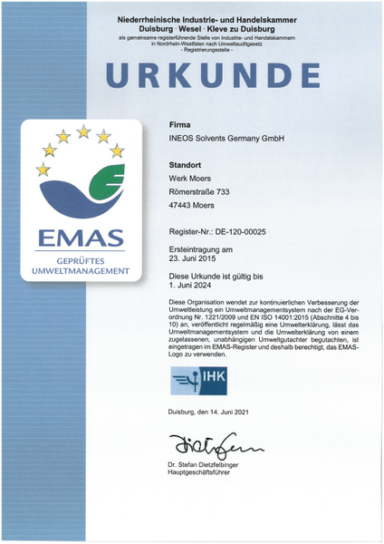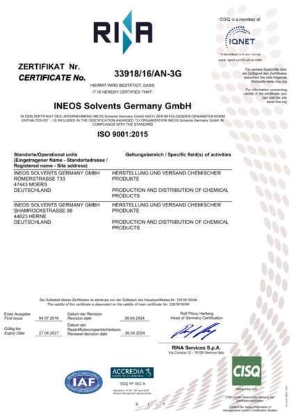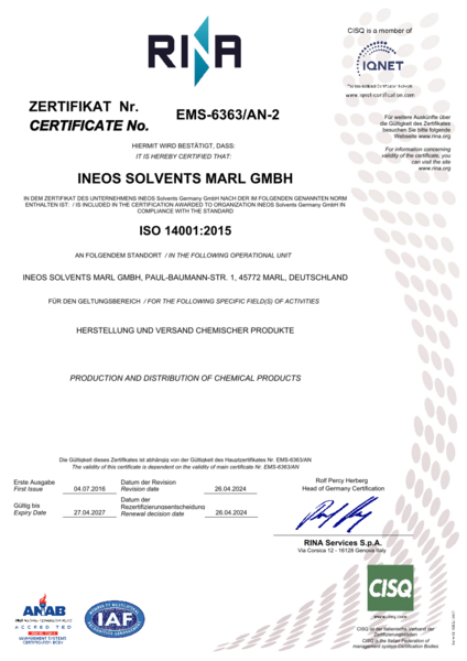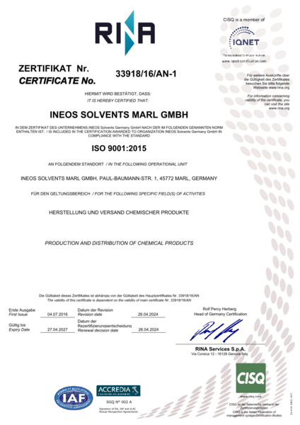 Die INEOS Solvents ist nach den geltenden nationalen und internationalen Richtlinien zertifiziert. Die Zertifikate gelten für die Bereiche Sicherheit, Umwelt- und Qualitätsmanagement sowie die Herstellung von Produkten: