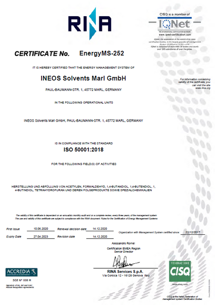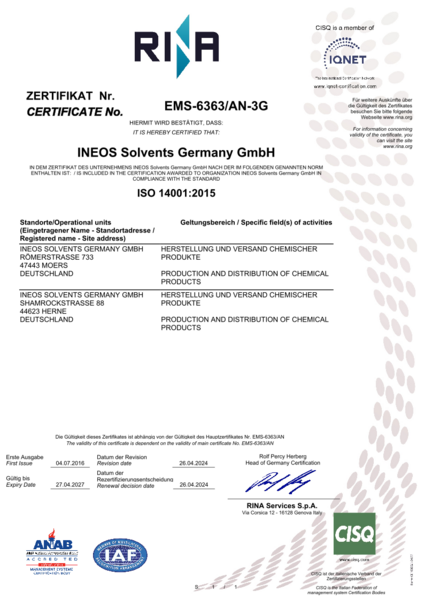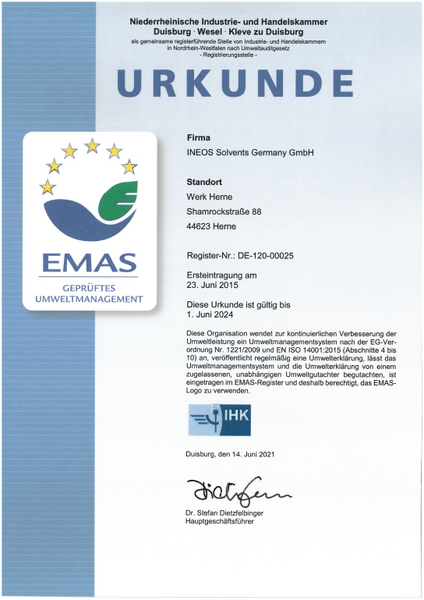 Die INEOS Solvents ist nach den geltenden nationalen und internationalen Richtlinien zertifiziert. Die Zertifikate gelten für die Bereiche Sicherheit, Umwelt- und Qualitätsmanagement sowie die Herstellung von Produkten: